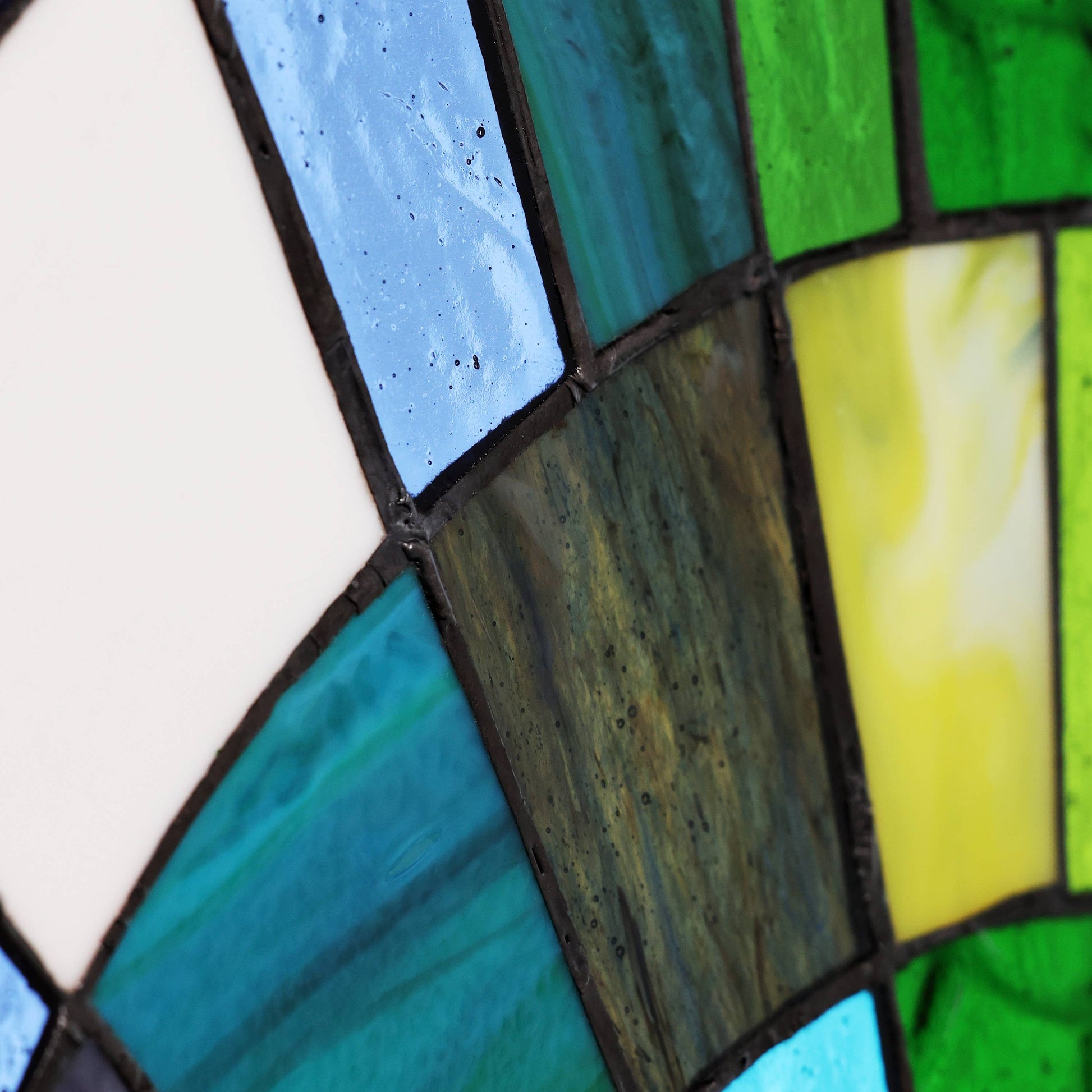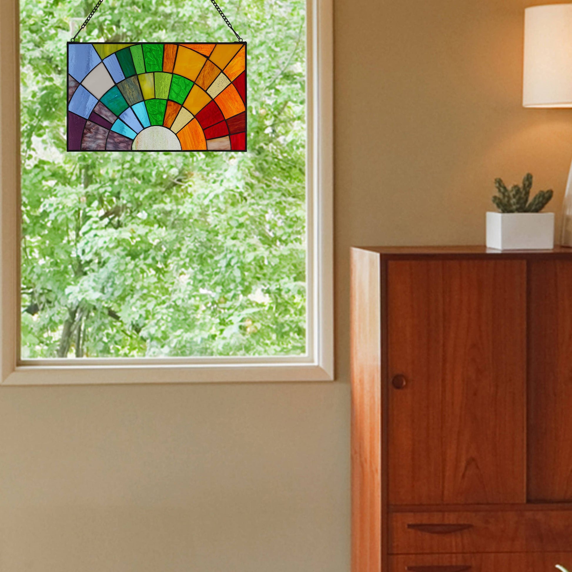 Experience a new way to decorate your home with this 20-inch window panel. Featuring a beautiful and intricate design inspired by nature, it’s crafted from multicolor stained glass, adding a touch of bohemian charm to any room. This rectangular window panel is horizontal and comes to life in a sunny window, radiating colors of purple, red, yellow, orange, blue, and green. Its included metal chain makes hanging a breeze, and it's easy to care for, just clean with a damp cloth or with lemon oil polish and dry with a clean cloth.