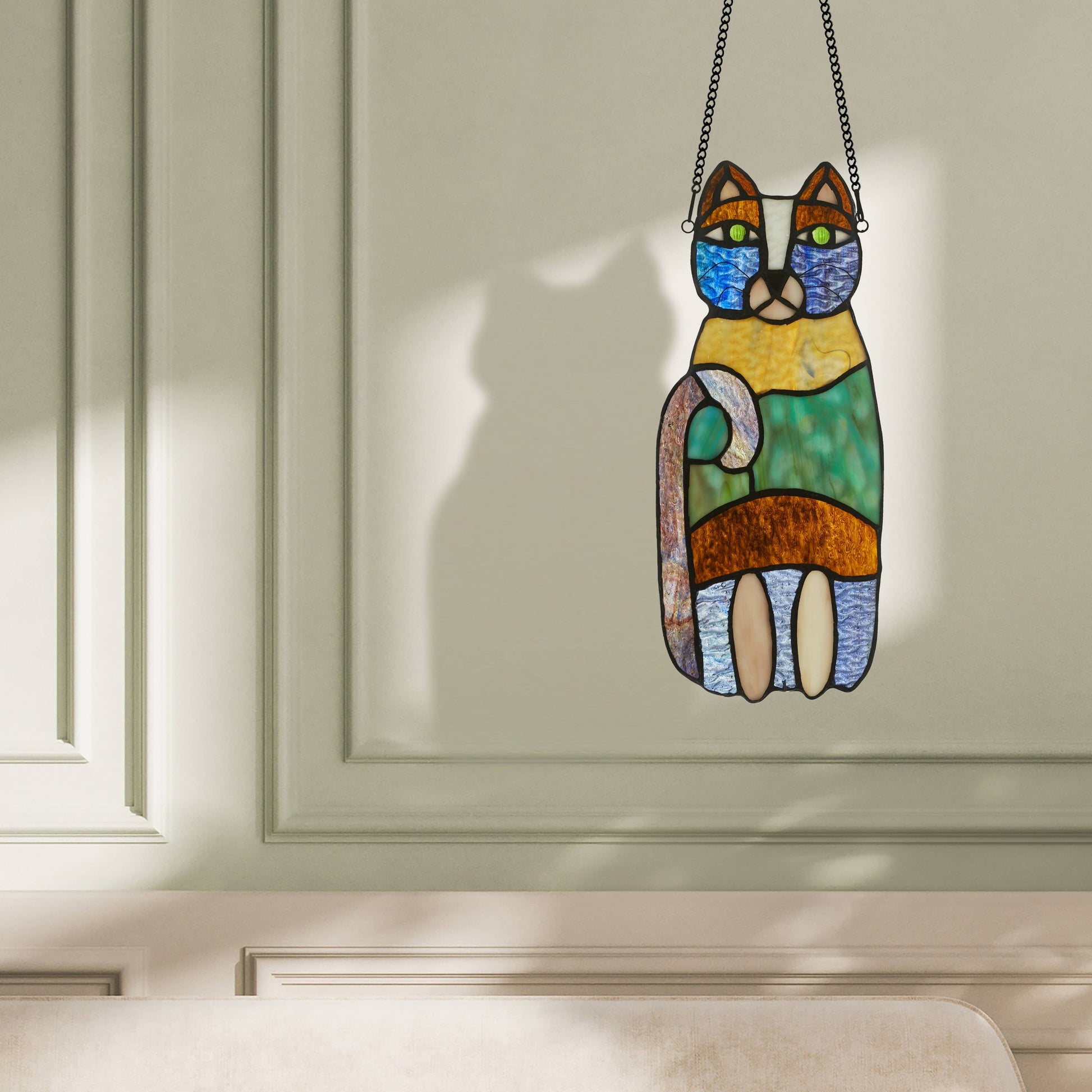 Calling all cat lovers. This whimsical panel is designed with funky purples, greens and brown stained glass. Each panel comes with a decorative hanging chain for support and strength so that you can easily install it and enjoy. This 13"H vertical shaped stained glass suncatcher is perfect for your home office, kitchen window or dining room space.