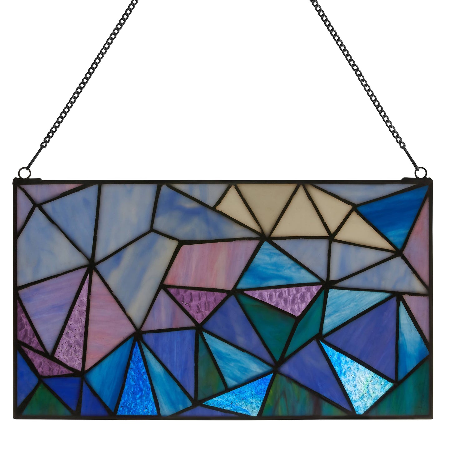 This cool abstract stained glass window panel offers a beautifully handcrafted piece of art for any sunny spot in your home. This decorative stained glass panel is perfect for use as a suncatcher or wall art, with the colors of the glass becoming more vibrant when light passes through. The rectangular stained glass suncatcher features a geometric design and is crafted from 52 individual glass cuts using traditional hand-soldering methods to create a one-of-a-kind design. Plus, it comes with a 24" chain for quick and easy hanging.