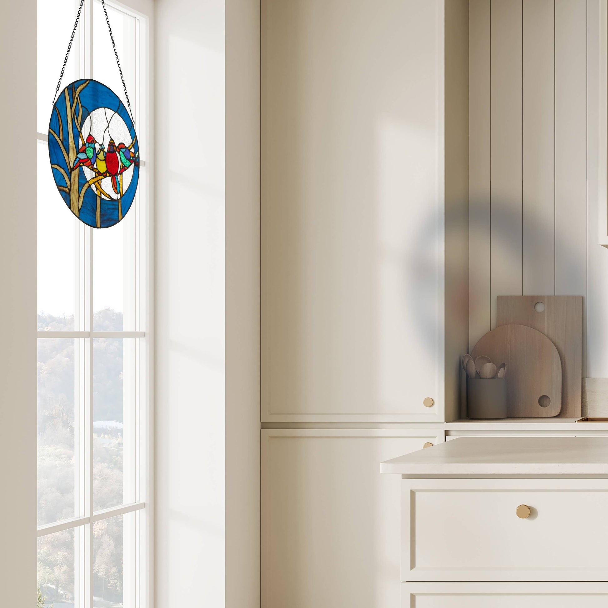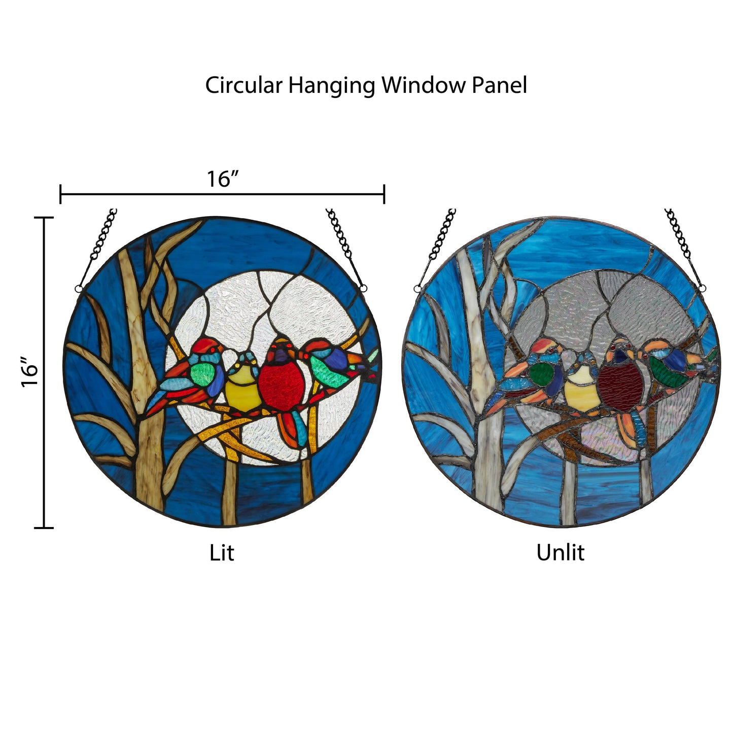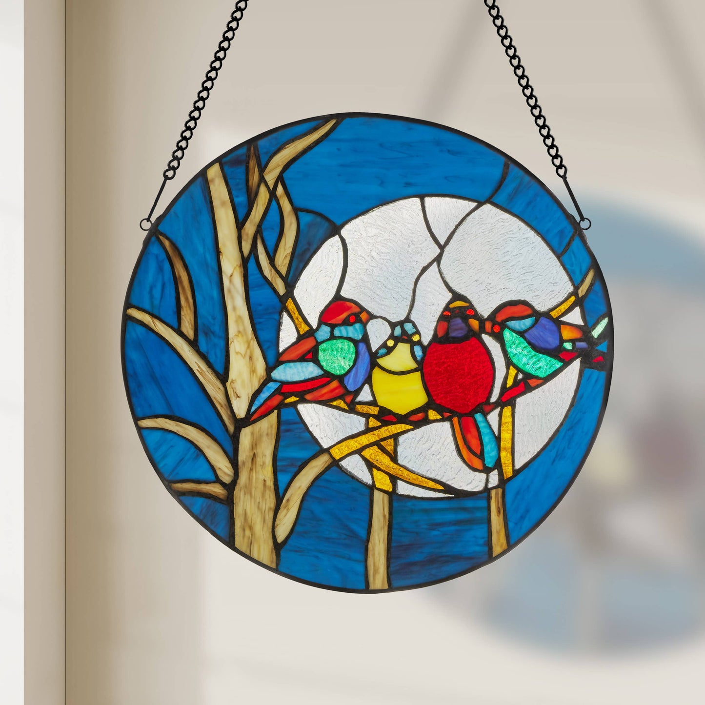 A deep blue moonlit night sky is the perfect backdrop for these four chirping birds. This 16"H round stained glass suncatcher creates a moody feeling with colors of deep blue, red and browns with more than 100 pieces of hand cut rippled and striated stained glass. The moon is designed with clear iridescent rippled glass – a great way to have privacy without losing light. Includes a hanging chain. Perfect addition to your fall decor.