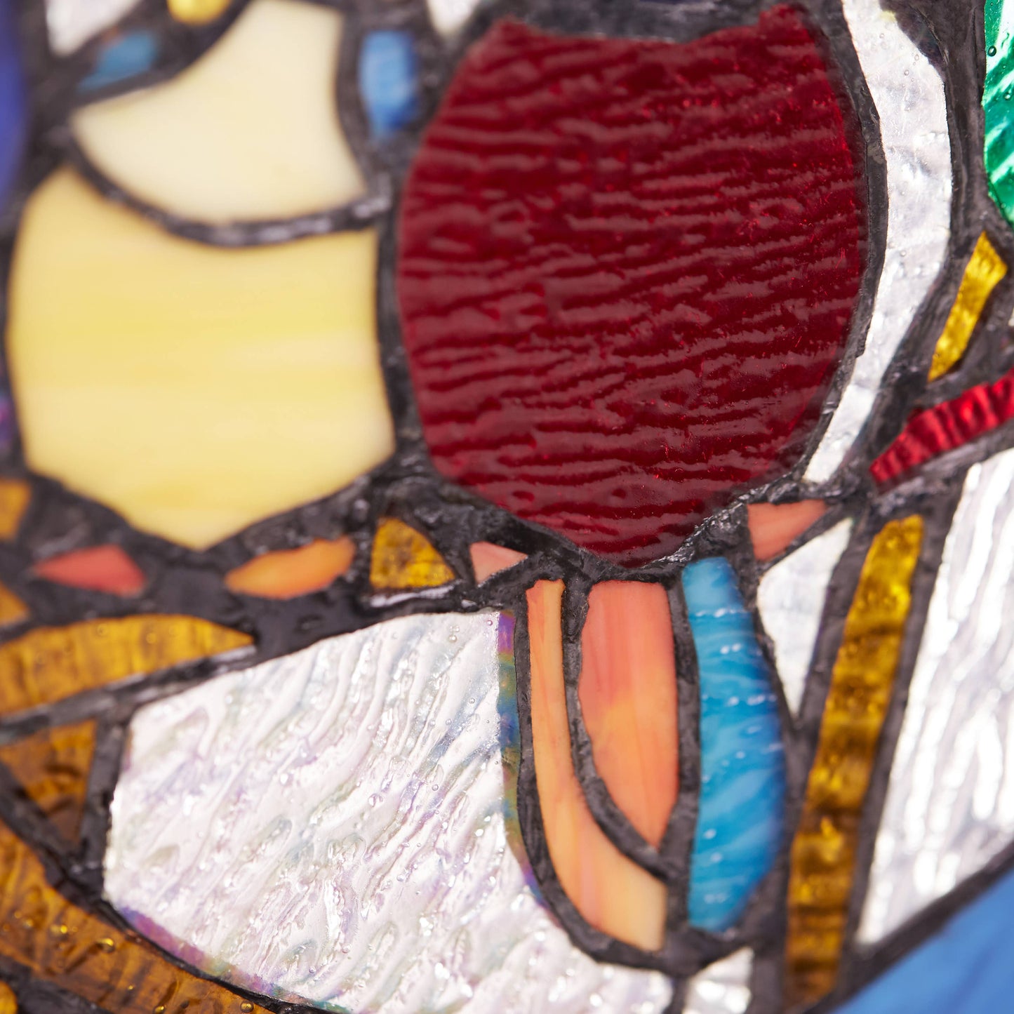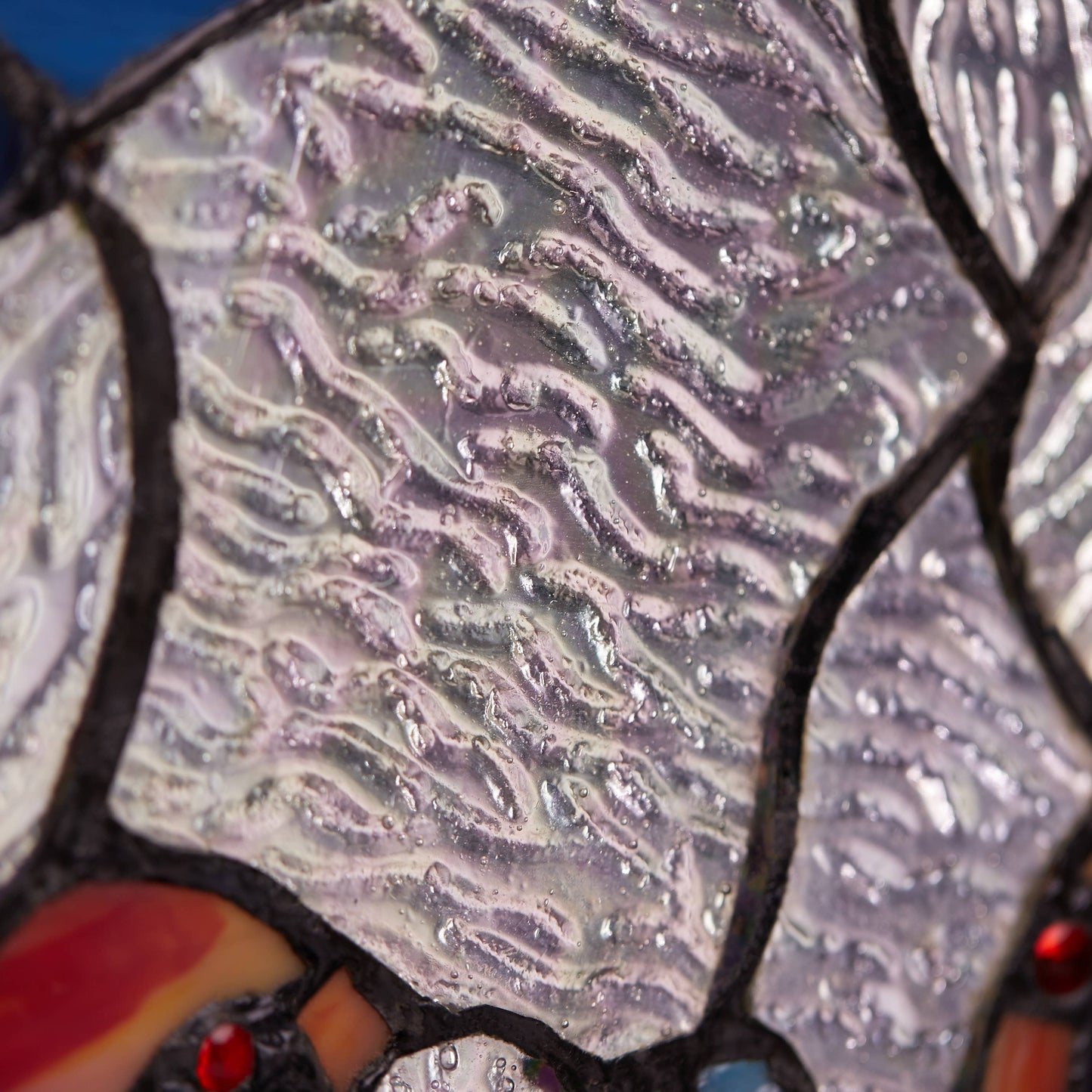 This piece has been soldered together using the copper foil method, made famous by Louis Comfort Tiffany in the early 1900s. A variety of glass types are used, including rippled and striated glass for added detail and dimension. The beauty of stained glass is its transformation of brightness and allure when illuminated by natural light.